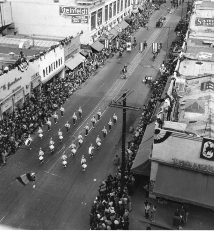 “School was out Thursday and Friday, so everyone could go to the downtown parade on Thursday and to the rodeo, which continued through the weekend. High schools all had ‘Rodeo Queens’ who were also shown off during the parade.”